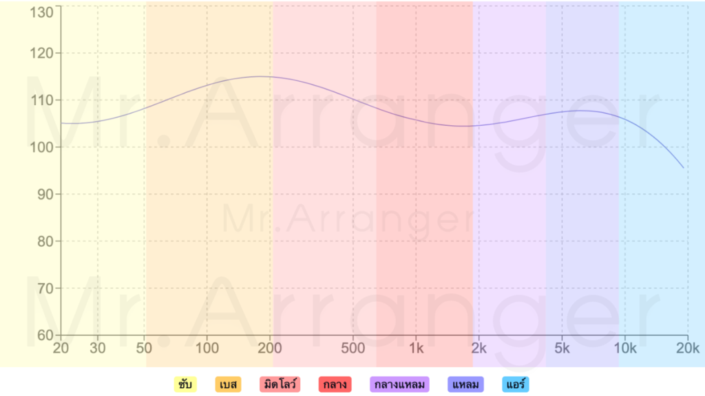 - ความถี่สูง (เทรเบิล): 4 kHz ถึง 20 kHz – ช่วงนี้รวมถึงเสียงที่คมชัดและสดใส เช่น ฉาบและเสียงร้องที่มีระดับสูง