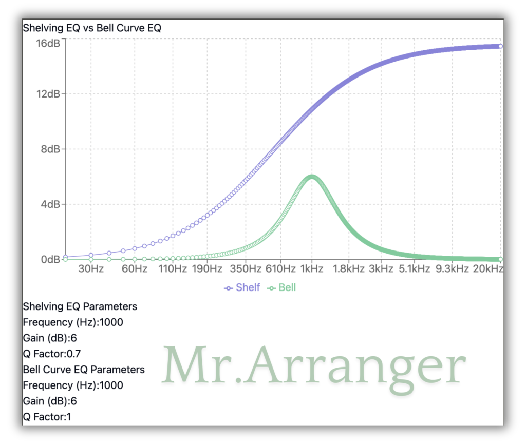 เพื่อความเข้าใจที่ชัดเจนยิ่งขึ้นเกี่ยวกับความแตกต่างระหว่าง Shelving EQ และ Bell Curve EQ ลองพิจารณาภาพประกอบนี้: