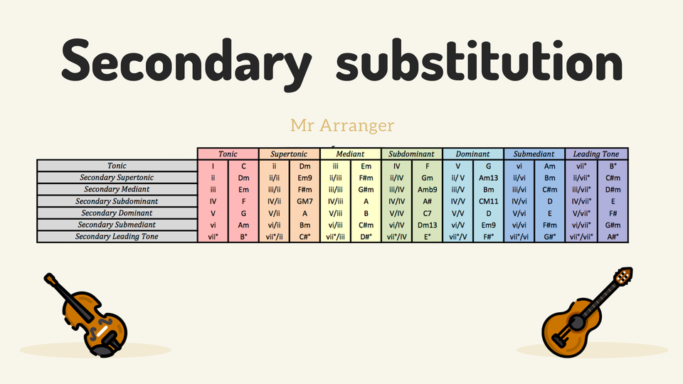 24/12/2021การใช้เสียงประสานโดยเทคนิค substitution ถือเป็นหนึ่งกระบวนท่าขั้นสูงของการวางคอร์ดเพลง และมักสร้างความงงงวยให้แก่คนที่พอจะรู้จักคอร์ดหรือสเกลอยู่ไม่น้อย อย่างเช่น คอร์ด D7 ในคีย์ C major หรือคอร์ดยืมในภาษานักดนตรีเรียกกัน ในทางเทคนิคจะเรียกว่า substitution หรือการคิดคอร์ดใหม่แทนจากคอร์ดเดิมที่เคยมีอยู่ ซึ่งเจ้าคอร์ดยืมนี้มันมาจากการสมมุติหรือให้ความสำคัญกับคอร์ดนั้นๆที่เล่นอยู่ ไม่ว่าจะเป็นการเล่นให้ยาวขึ้น เล่นบนจังหวะตก หรือการใช้เป็นแนวเบสของคอร์ดนั้นๆ เมื่อเราได้ยินว่าคอร์ดนั้นสำคัญแล้วที่นี้…