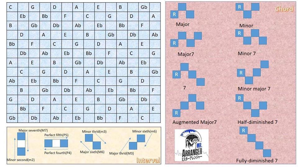 คอร์ดและขั้นคู่เป็นเรื่องง่ายๆ เพียงแค่เลือกรูปด้านล่างเทียบกับในตารางก็จะได้ขั้นคู่นั้นๆ