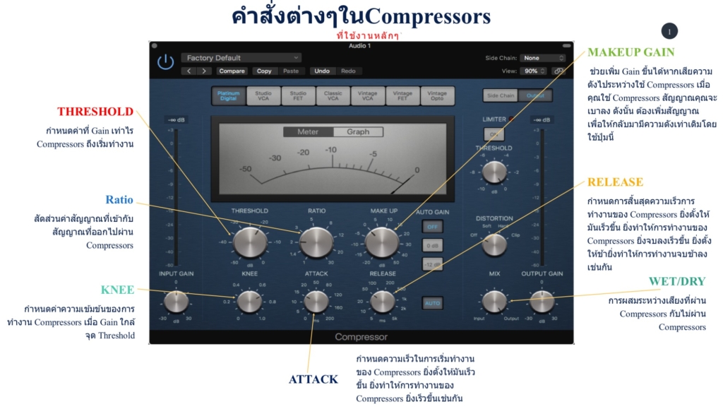 17/03/2020คำแนะนำการทำงานของแต่ละปุ่มแบบง่าย ๆ สำหรับการใช้ Compressors 1Thresholdกำหนดค่าว่าเท่าไร Compressors ถึงจะทำงาน สัญญาณใดที่มากกว่าค่า Threshold ที่ตั้งไว้จะทำให้ Compressors นั้นเริ่มทำงาน Compressors จะไม่ทำงานเมื่อ สัญญาณอยู่ต่ำกว่าค่า Threshold 2Ratioสัดส่วนค่าสัญญาณที่เข้ากับสัญญาณที่ออกไปผ่าน Compressors ตัวอย่างเช่น ถ้าคุณตั้ง Ratio อยู่ที่…