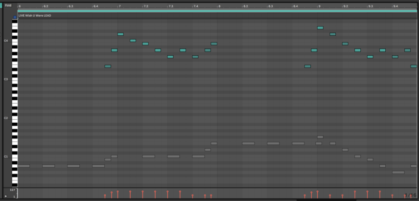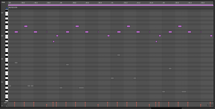 แนวคิดนี้คล้ายกับการประพันธ์ดนตรีออเคสตราที่เมื่อวงออเคสตราทั้งวงกำลังเล่นคอร์ดเบสและเชลโลจะเล่นโน้ตที่ต่ำกว่าในขณะที่ไวโอลินและเครื่องเป่าเสียงสูงจะเล่นโน้ตที่สูงขึ้น ลองเปิดใช้งานโน๊ตต่ำในช่องของ Rhodes ในไฟล์โปรเจ็กที่เราให้ไว้และคุณจะสังเกตเห็นว่าเสียงของโรดส์แย่ลงมากเมื่อรวมโน้ตเหล่านั้น มันเหลือเชื่อมาก! กลับไปที่เบสไลน์ในลูปสี่บาร์ โน้ตจะดีดพร้อมกันกับกระเดื่อง สร้างความสัมพันธ์ที่ชัดเจนระหว่างเบสและกระเดื่องโดยเบสจะเล่นเป็นอ็อกเทฟอย่างสม่ำเสมอเพื่อเติมช่องว่างให้กระเดื่อง เคล็ดลับที่ชาญฉลาดอีกประการหนึ่งของการใช้เสียงเบสคือการเปลี่ยนแปลงเล็กน้อยของรูปแบบบนบาร์ที่สาม ในบาร์ที่หนึ่งสองและสี่ โน้ตตัวที่สามจะเข้าที่โน้ตตัวที่ 1/16 ที่เจ็ด แต่ในอีกสองบาร์ถัดไปจะเข้าที่โน้ตตัวที่ 1/16 ที่แปดเช่นเดียวกับใน ‘Around The World’ Daft Punk ได้เล่นอีกครั้งในลีดที่ทำงานร่วมกับเสียงเบสได้อย่างลงตัว นี่คือเสียงกีต้าร์ที่ muted และในแถบด้านล่างเราได้วาง MIDI ของมันด้วยเสียงเบส