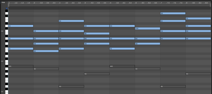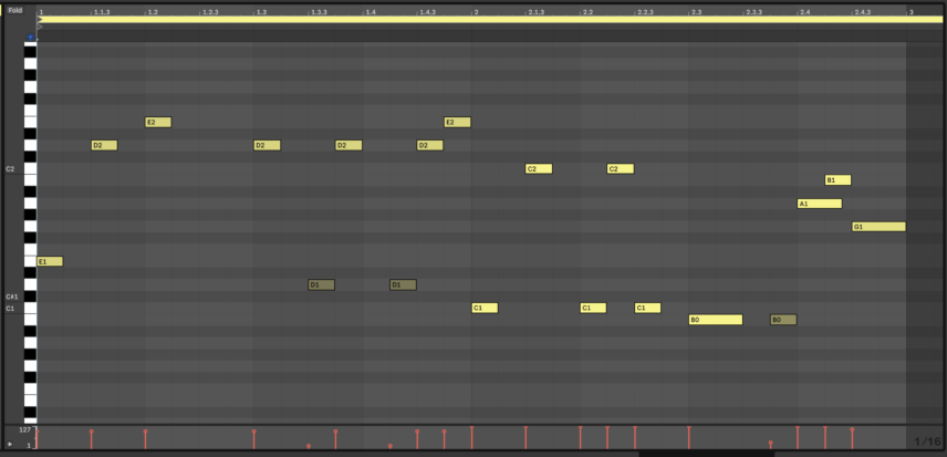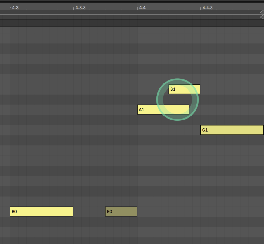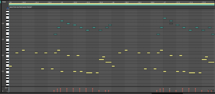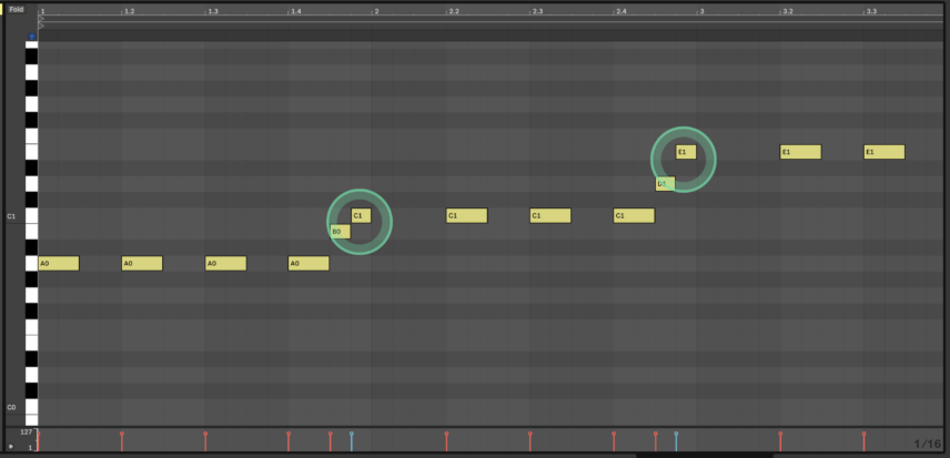 สองคือเบสสไลด์ที่โน้ตจะสไลด์เข้าหากัน สิ่งนี้เกิดขึ้นที่ส่วนท้ายของแถบที่สองของลูปโดย A เลื่อนเข้าไปใน B ก่อนที่จะกดโน้ตตัวสุดท้าย G ซึ่งง่ายกว่ามากในการสร้างดนตรีใหม่ด้วยเสียงเบสที่แท้จริง แต่ฟังก์ชั่น glide บน synths ก็ทำงานได้ดีเช่นกัน เราใช้การตั้งค่าล่วงหน้าของของ Ableton ที่มี glide ที่ตั้งโปรแกรมไว้ล่วงหน้าซึ่งจะทำงานเมื่อโน้ตมากกว่าหนึ่งตัวซ้อนทับกันในไลน์เดียวกัน