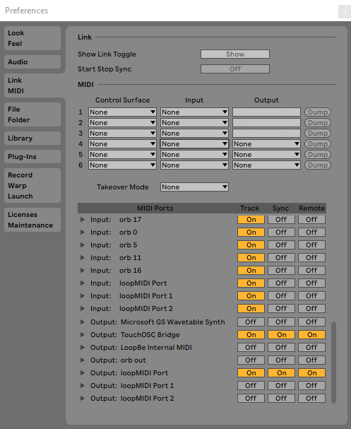 จากนั่นให้เปิด DAW หรือ ซินธ์อะไรก็ได้ที่ถนัดแล้วเลือก MIDI input ที่ตั้งไว้นะครับ ในที่นี้ผมเลือก MIDI input port เข้าที่ Ableton Live โดยติ๊กที่ช่อง input loopMIDI port เป็น on และลองเอาพวกซินธ์ใส่ในแทร็คแล้วกด monitor in ไว้เพื่อให้เราได้ยินเสียงเมื่อ orca ส่ง MIDI มานั่นเอง