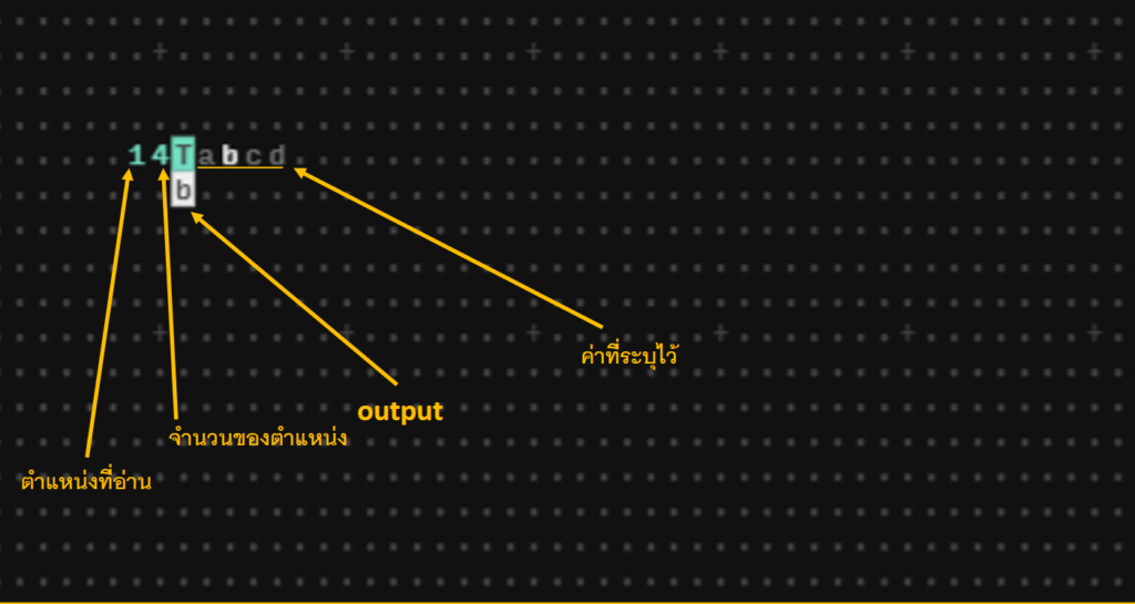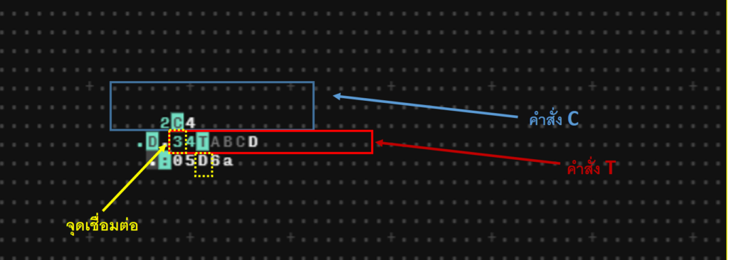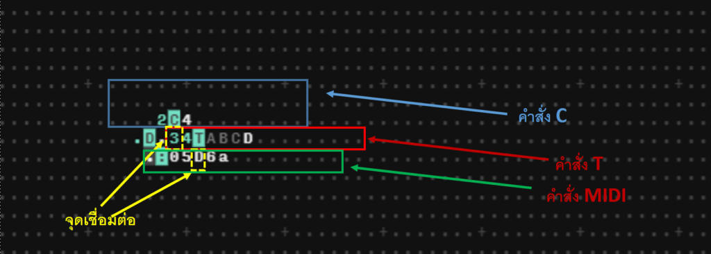 บทเรียนนี้จะเป็นการเริ่มสร้างทำนองครับ โดยมีการทำงานของคำสั่ง T และ C มาดูที่ T กันก่อนนะครับโดยเมื่อเราใส่ T ลงไปในที่ว่างจะเห็นมีจุด2จุดด้านซ้าย(..T)2ตำแหน่งที่และ output ที่จุดด้านล่างนะครับ ยกตัวอย่าง เช่น 14Tabcd จุดด้านซ้ายของTสองจุดก็คือ 4 สี่คือจำนวนข้อมูลด้านขวาครับมี4ตัวอักษร ส่วน1ก็คือลำดับของค่าด้านขวาที่อ่านอยู่ในขณะนั้นซึ่งก็คือตัวbนั่นเองเพราะตัวaเราจะนับเป็นศูนย์ครับ ที่นี้เมื่อเราเพิ่มสี่เป็นห้าหกไปเรื่อยจะเห็นว่าจำนวนแถวด้านขวาจะออกยาวไปเรื่อยๆ แต่ตอนนี้จะใช้แค่4จุดก่อนนะครับจากนั้น เราสามารถใส่ค่าอะไรไปก็ได้ที่ด้านขวาของT ในตัวอย่างผมได้ใส่โน๊ตabcd ไปนั่นเองครับ จากนั้นลองเลื่อนเคอร์เซอร์สีเหลืองมาที่ 1แล้วเปลี่ยนเป็น 0 1 2 3(4ตำแหน่ง) จะเห็นว่าค่าOutputด้านล่างจะเปลี่ยนไปตามตำแหน่งที่อ่านจากด้านขวา(abcd)ครับ
