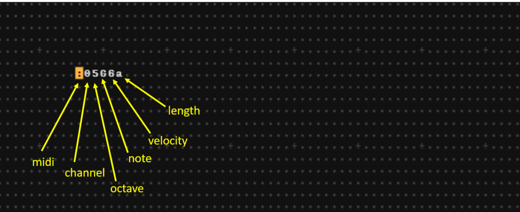 หลังจากเชื่อมต่อแล้วเราจะมาเริ่มใช้ orca ด้วยคำสั่งง่ายๆกันก่อนโดยจะส่งMIDI ออกไปที่โน๊ต อันแแรกเลยที่เราต้องทราบคือคำสั่ง MIDI out ใน ocra จะใช้เครื่องหมาย ทวิภาค : และตัวเลขด้านหลัง 5 ตำแหน่งทีจะระบุข้อมูล midi ที่จะส่งออกไปครับโดยเรียงลำดับ จากซ้ายไปขวาคือ channel, octave, note, velocity, length โดยเรียงลำดับตามนี้ เช่น :05G6a ซึ่งจะพิมพ์ลงไปตรงส่วนใหนของตารางก็ได้นะครับ โดยจะแยกออก