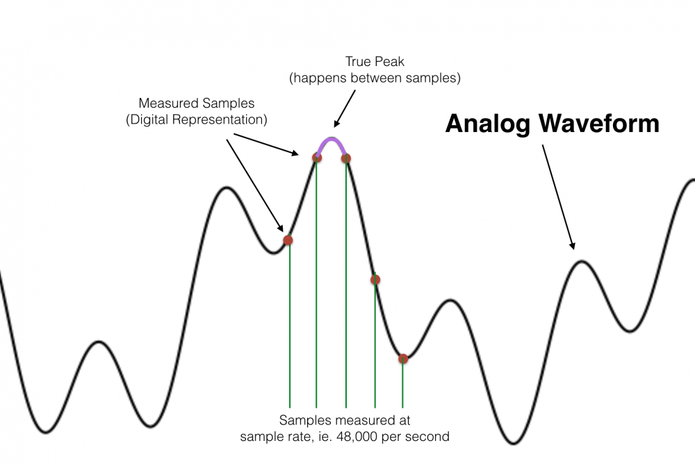 True-peaks (บางครั้งเรียกว่า intersample peaks) เกิดขึ้นเมื่อสัญญาณดิจิตอลถูกแปลงกลับเป็นรูปคลื่นอะนาล็อก รูปร่างของรูปคลื่นแอนะล็อกอาจเกินการวัดแบบดิจิทัลได้มากถึงสองเดซิเบลในชั่วขณะ สิ่งนี้เกิดขึ้นเนื่องจากสัญญาณดิจิทัลทำการวัดทุกช่วง sample และสัญญาณแอนะล็อกจะสร้างข้อมูลใหม่ระหว่างการวัดเหล่านั้น ดูภาพด้านล่างสำหรับภาพปรากฏการณ์นี้ ด้วยเหตุผลนี้ บริการสตรีมมิ่งจึงระบุระดับสูงสุดของดิจิทัลที่อาจต่ำกว่า -1 dBfs