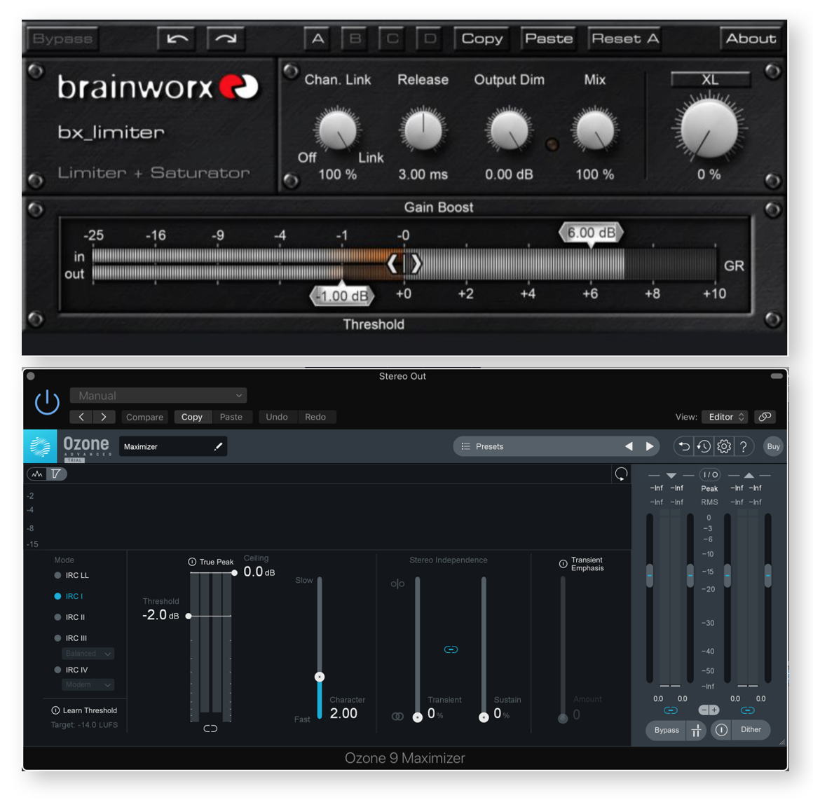 Brainworx bx_limiter (บนสุด) ให้ลิมิตเตอร์พื้นฐานบวกกับ saturation Ozone 9 Maximizer ของ Izotope (ด้านล่าง) ให้ maximizer ขั้นสูงเพื่อขัดเงามาสเตอร์ของคุณ