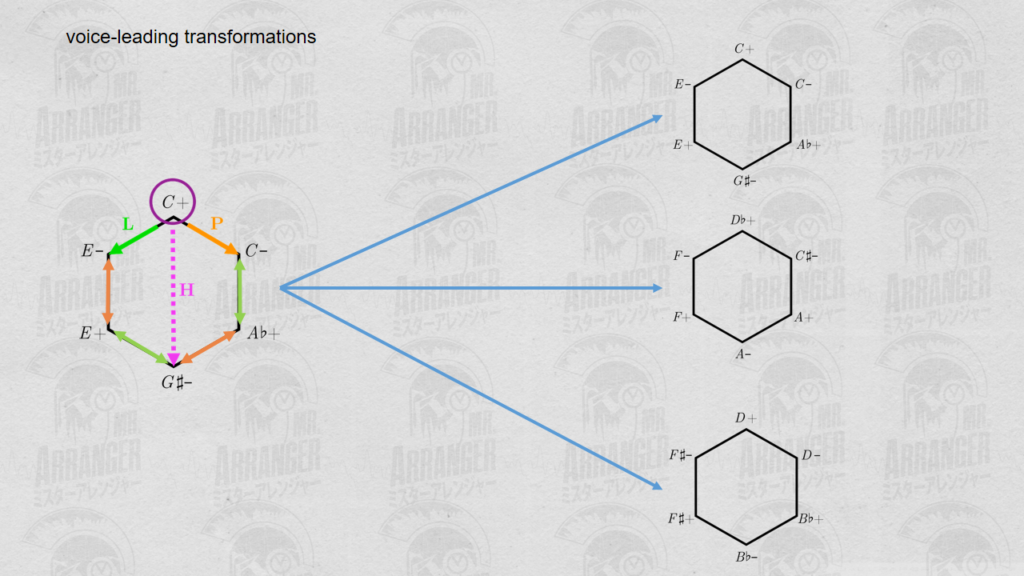 เมื่อใช้การเปลี่ยนรูปคอร์ดทั้งสองแบบP,L สลับกันหกครั้งจะได้คอร์ดจะวนกลับมาที่คอร์ดเดิม และสามารถเขียนให้อยู่ในรูปของหกเหลี่ยม (hexagon)และได้รูปแบบของการเปลี่ยนในแบบที่สาม คือ